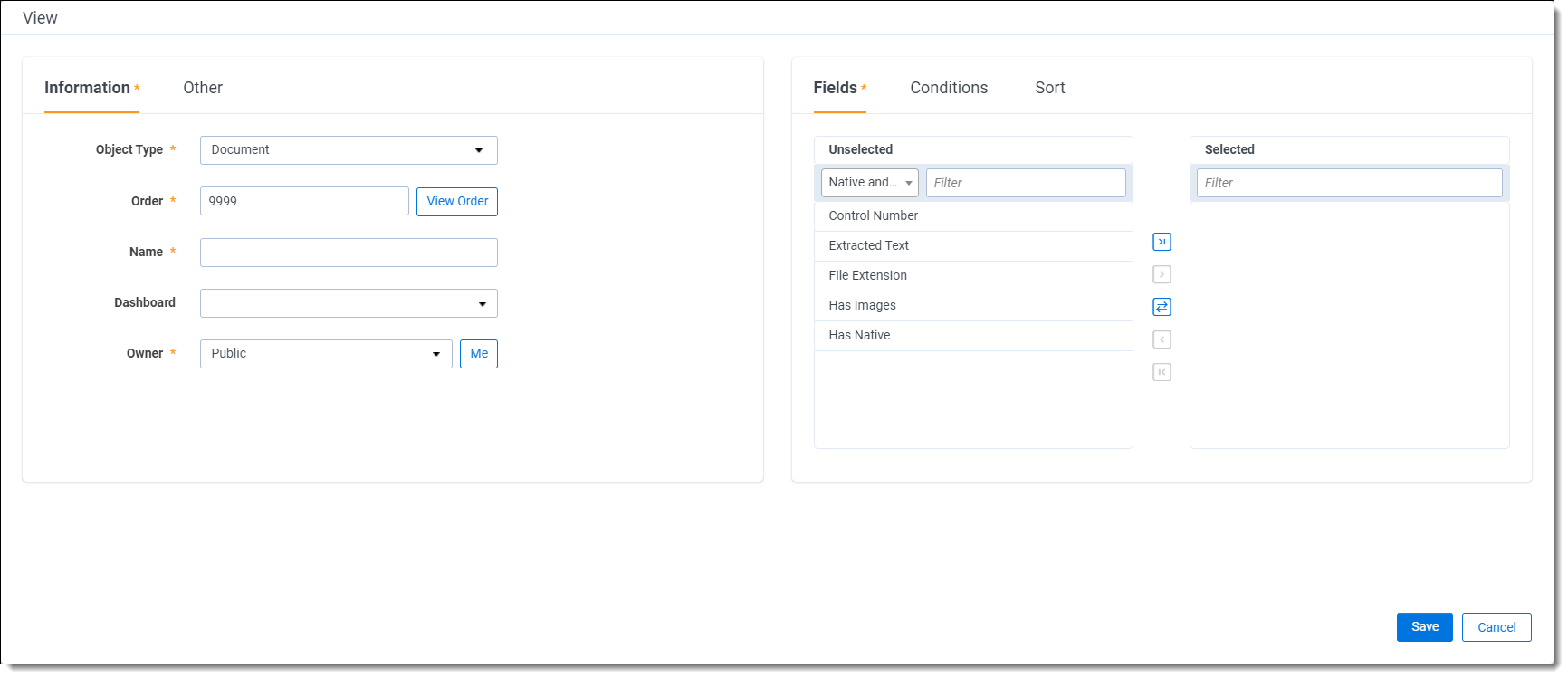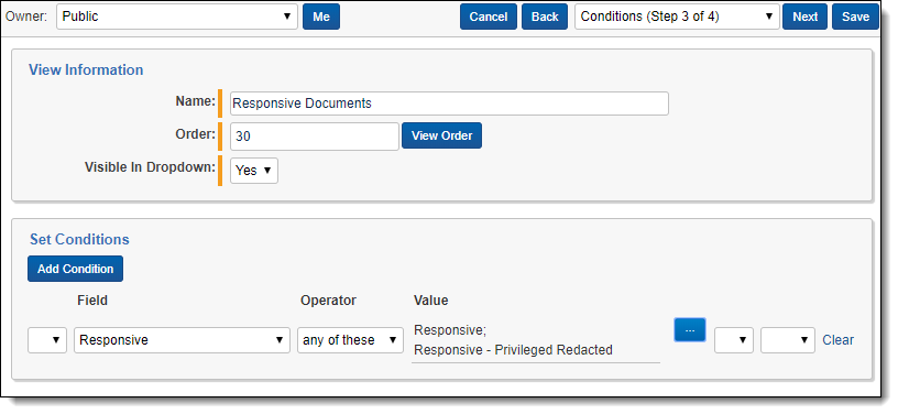 • Owner- sets the user(s) who can see the view. If the owner is set to Public, all users with rights to the view are able to see it. If the owner is set to a specific reviewer, the view is visible to only that reviewer. Clicking Me assigns the view to the logged in user.
