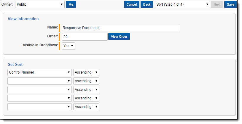 In the fourth and final step of the wizard you define the default sort order of the view. If you don't select a sort criterion, the view sorts by artifact ID. Users are able to temporarily sort the view by any field that has Allow Sort/Tally set to Yes included on the view.