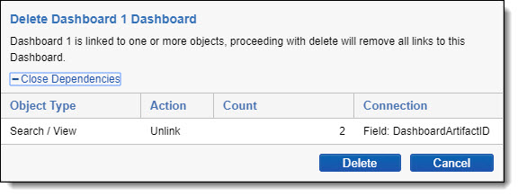 If you delete a dashboard with dependencies, a pop-up appears with a list of dependencies.