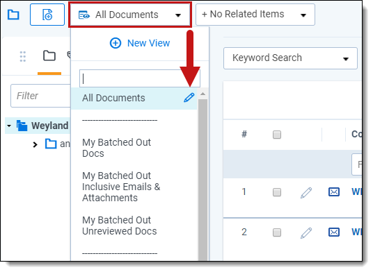 • For all Relativity Dynamic Objects (RDO), and most system objects, you can click on the view drop-down to display the list of views. Next, click Edit icon next to the view you wish to edit, and then move through the steps for creating a view with field categories.