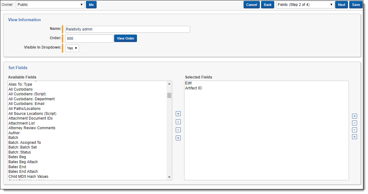 When you edit a view from within the view itself, Relativity guides you through the four-step wizard. Complete the fields on the form and click Next after you complete each step. See the following sections to learn about each steps fields: