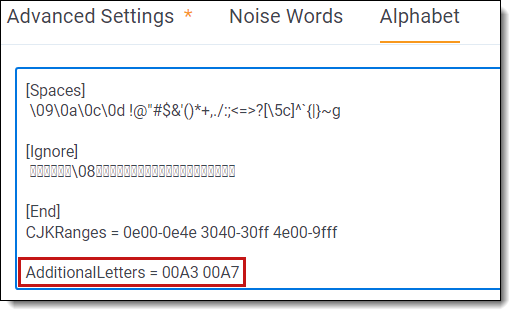 | Characters outside the ASCII code range such as § and £ | Create an AdditionalLetters section at the bottom of the alphabet file and insert the character's Unicode value. |