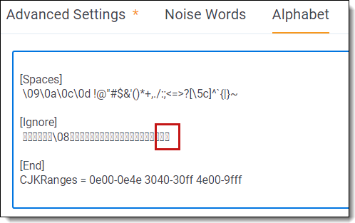 - Repeat these steps for any other symbols that you need to make indexed. Delete the appropriate symbols from the [Spaces], [Ignore], or [Hyphens] sections. Please note, if you edit the hyphen, space, or ignore section, you will need to also keep the leading space. Removal of leading spaces will cause errors in Relativity.