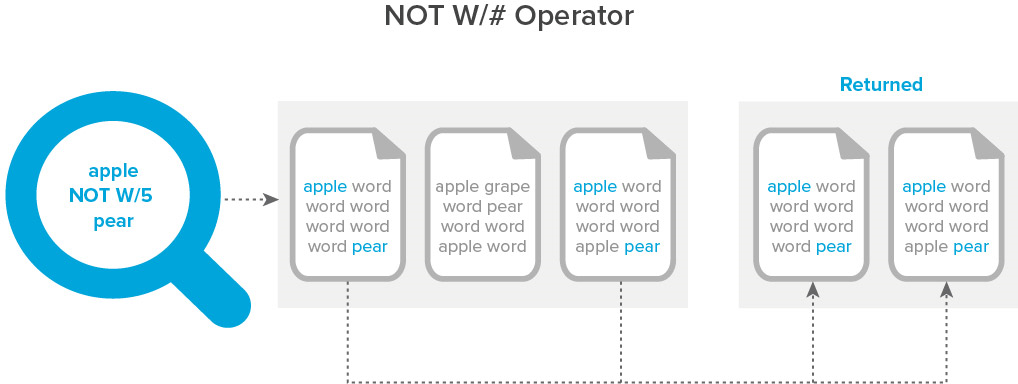 For example, the search expression apple NOT W/20 pear returns documents that contain apple when separated from pear by at least 20 words. It also returns documents that do not contain pear. Documents that contain apple separated from pear multiple times with varying proximity return as long as there is at least one concurrence where apple separates from pear by at least 20 words.