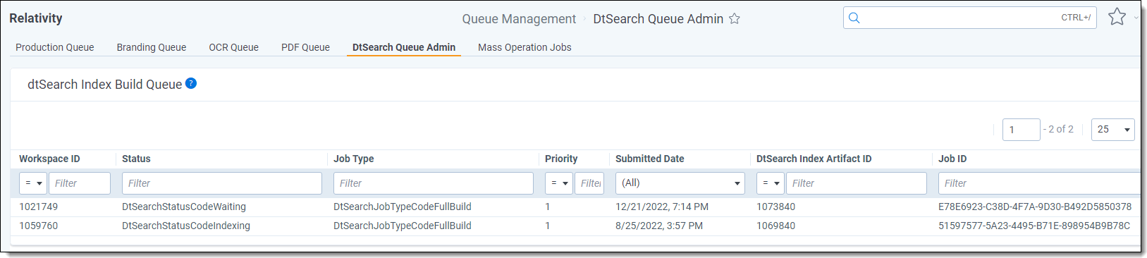 With the dtSearch queue admin page, you can monitor all dtSearch indexing jobs across an instance of Relativity that are not yet complete. This page only shows dtSearch jobs that you can access.