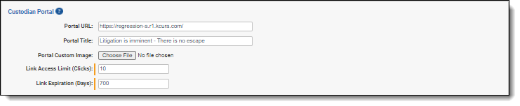 Update the fields in the Custodian Portal. Define how the Custodian Portal will look and act to the custodian interacting with it. Add the URL, title, and a custom image to the portal.