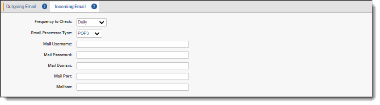 Update the fields in the Incoming Email section. The Incoming Email section is used to allow Legal Hold emails that are replied to by Custodians to be ingested into Legal Hold. If this functionality is not needed, it can be disabled by changing the Frequency to Check field to Select ...
