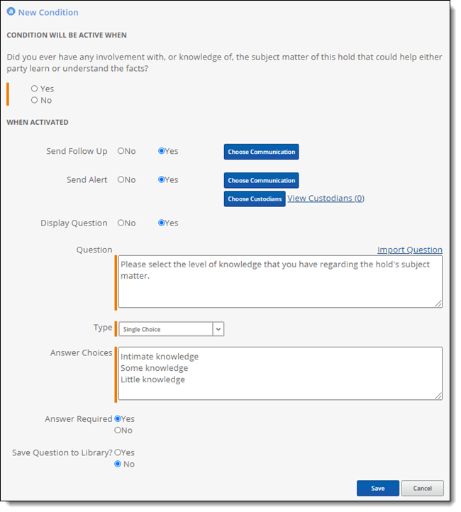Select Yes to add a follow-up question to the original question. Add, or import a question, to follow up after the custodian's condition activating response.