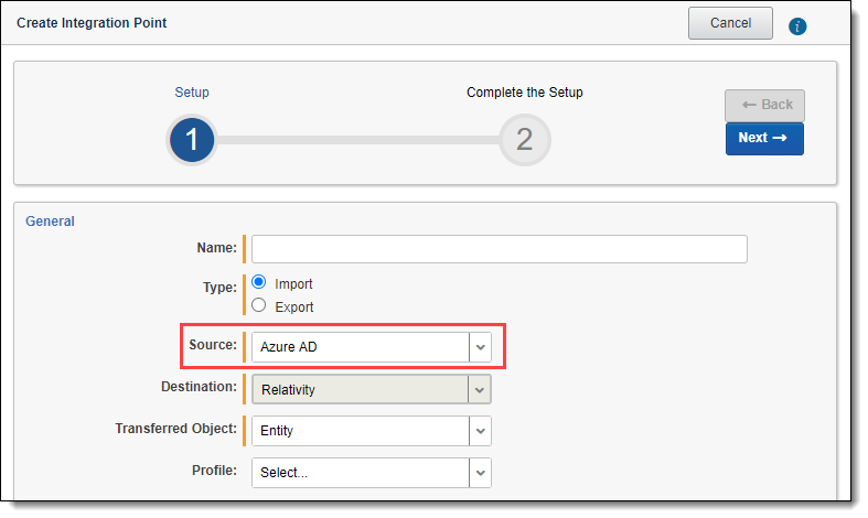 Continue to create your import integration point by connecting Relativity to your Microsoft Azure AD data source. You can select to import from your commercial or government Azure AD profile. Follow the steps below.