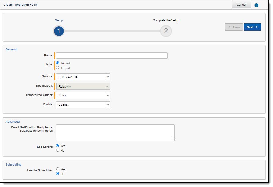 • End Date - (Optional) the date that you want Integration Points to stop syncing the data. Leaving the End Date blank causes the Integration Point to run indefinitely at the scheduled interval.