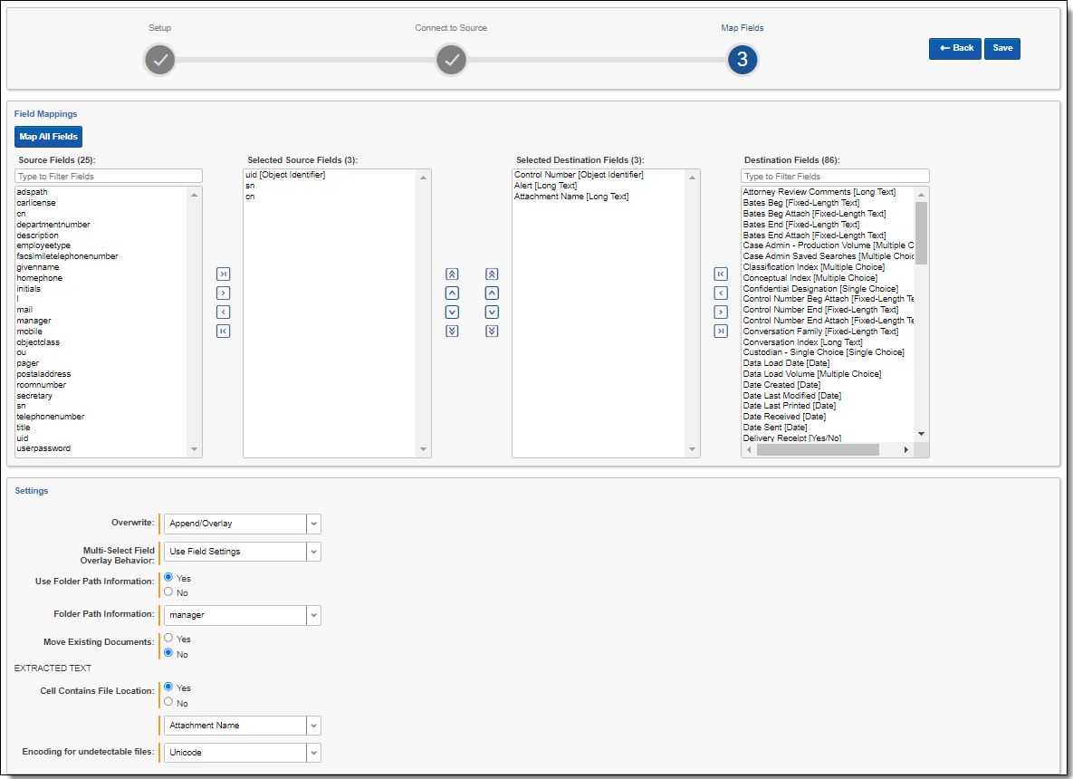 • Extracted Text - select the destination field that is mapped to a path to Extracted Text files. The content of these files will be read into the selected field. Note that only Long Text destination fields that are mapped will show up as options in the Extracted Text dropdown. You can select an encoding type for the extracted text files as well.