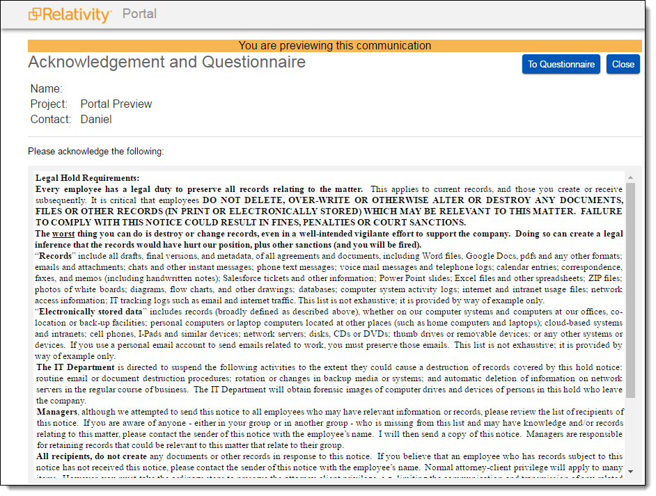 • Preview Portal - preview what the custodian will see in the Custodian portal. If there's a questionnaire attached to the communication, you can click To Questionnaire to preview and interact with the questionnaire that the custodian will see. Note that in preview mode, you can't submit any questionnaire responses that you might have selected during your preview.