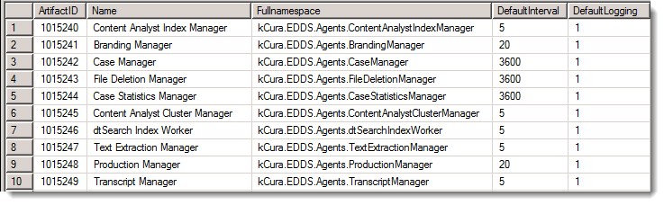 In the EDDS database of Relativity, there is a table called AgentType. In each line listed in SQL, the table has a number of columns and a row for each agent. The following image shows only a few columns.