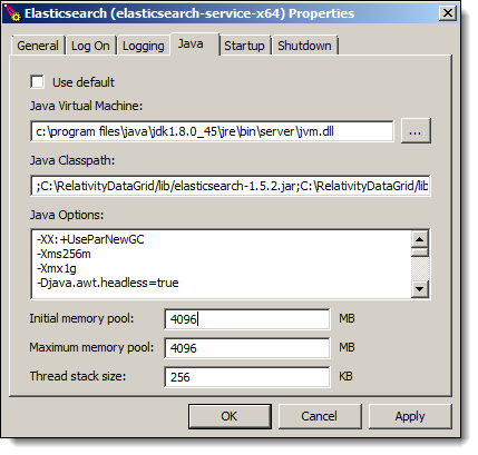 The Maximum memory pool should be half of the total RAM of the machine with a maximum setting of 30GB (30000 MB). It's recommended that you keep the Thread stacks size value at its default of 256.