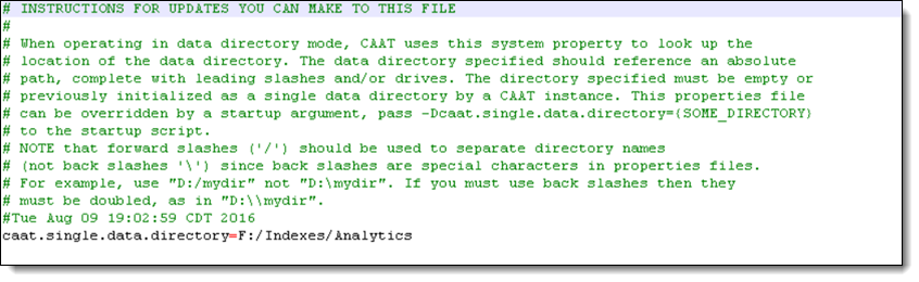 2. Open the single-data-dir.properties file in a text editor. Change the “caat.single.data.directory” line to point to your new index location. The file path should have a forward slashes ( / ).