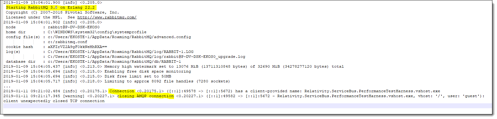 By default, RabbitMQ logs at the info level and logs service events such as incoming connections and service start-up and shutdown.