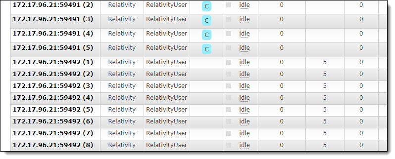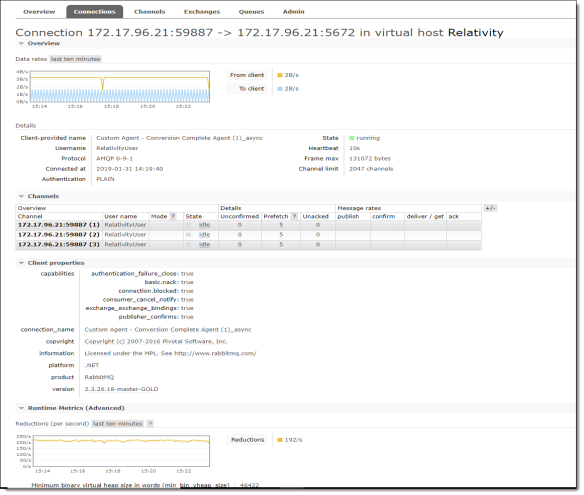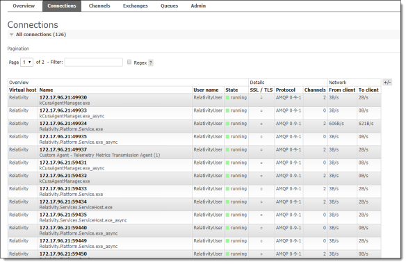 The connection tab contains all active connections within the RabbitMQ cluster. Connections correspond to the AppDomain name. This is generally either the process name or the name of the Relativity agent.