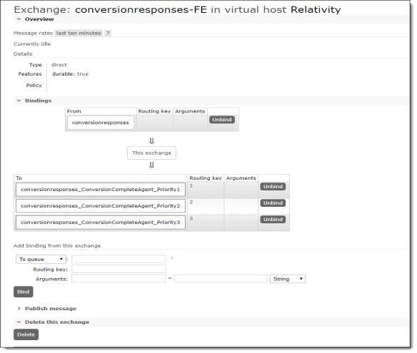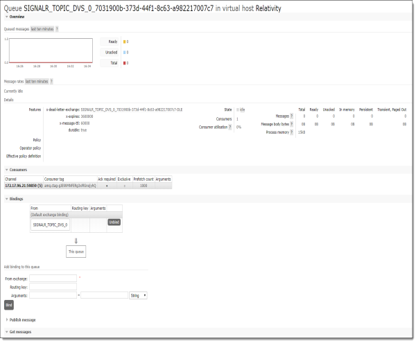 Clicking on an exchange takes you to the exchange detail page where you can view a graph of the message rates and details about the exchange and its bindings. Bindings are what this exchange forwards the message to; the binding can either be another exchange or a queue (subscription in the Relativity.ServiceBus library). In the case of a fanout type exchange, it broadcasts all messages to everything it is bound to.With a direct exchange, messages are only forwarded to bindings for the routing key that they match. You can navigate to the queue or exchange that is bound to the exchange you are viewing by clicking on the name in the Bindings section.