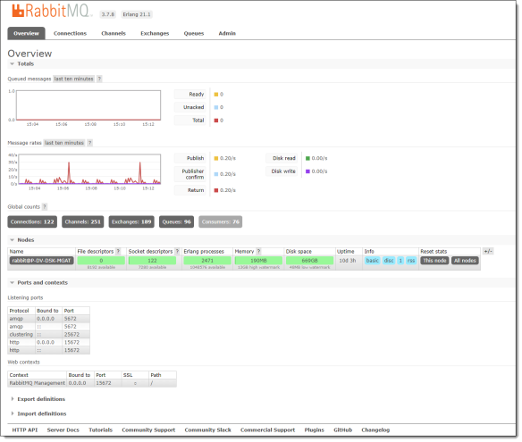 - On the Overview tab in the management UI, ensure RabbitMQ is listening on the expected ports: