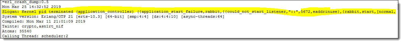The Slogan is the reason why the dump file was taken in the first place. In the case above, you can see that there was an application start failure for RabbitMQ where it could not start a listener on port 5672. For more information on the other data in the dump file and some common messages that may appear in the dump file, see How to Interpret the Erlang Crash Dumps.
