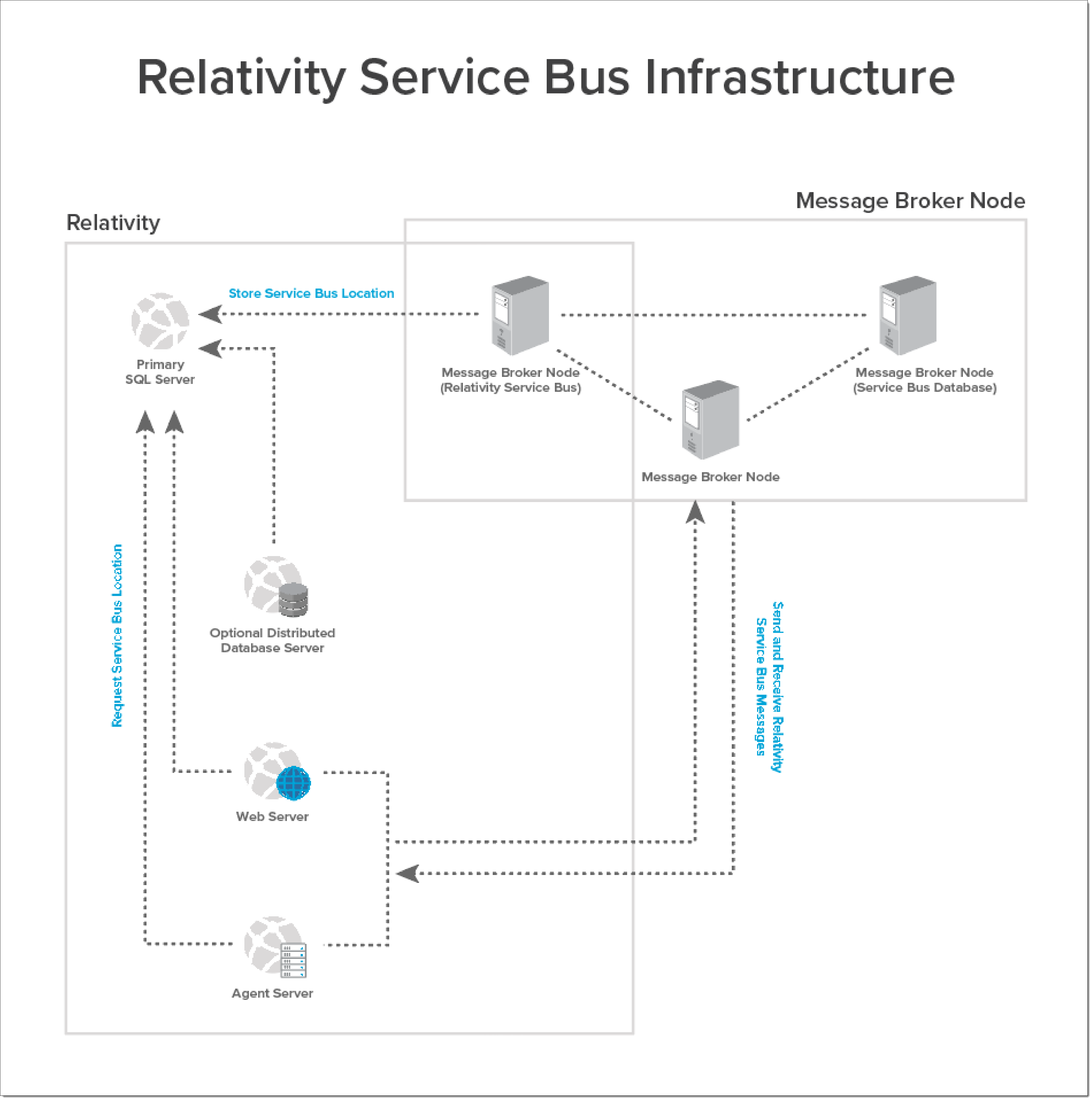 The web and agent servers request information about the location of the Relativity Service Bus from the primary SQL Server. The Relativity Service Bus then facilitates communication between application components by sending and receiving messages. A typical Relativity installation requires only one message broker server. You can optionally configure your environment to have multiple servers. This can be accomplished by leveraging a RabbitMQ cluster. The following diagram illustrates how the Relativity Service Bus integrates with your environment's infrastructure in a typical installation.