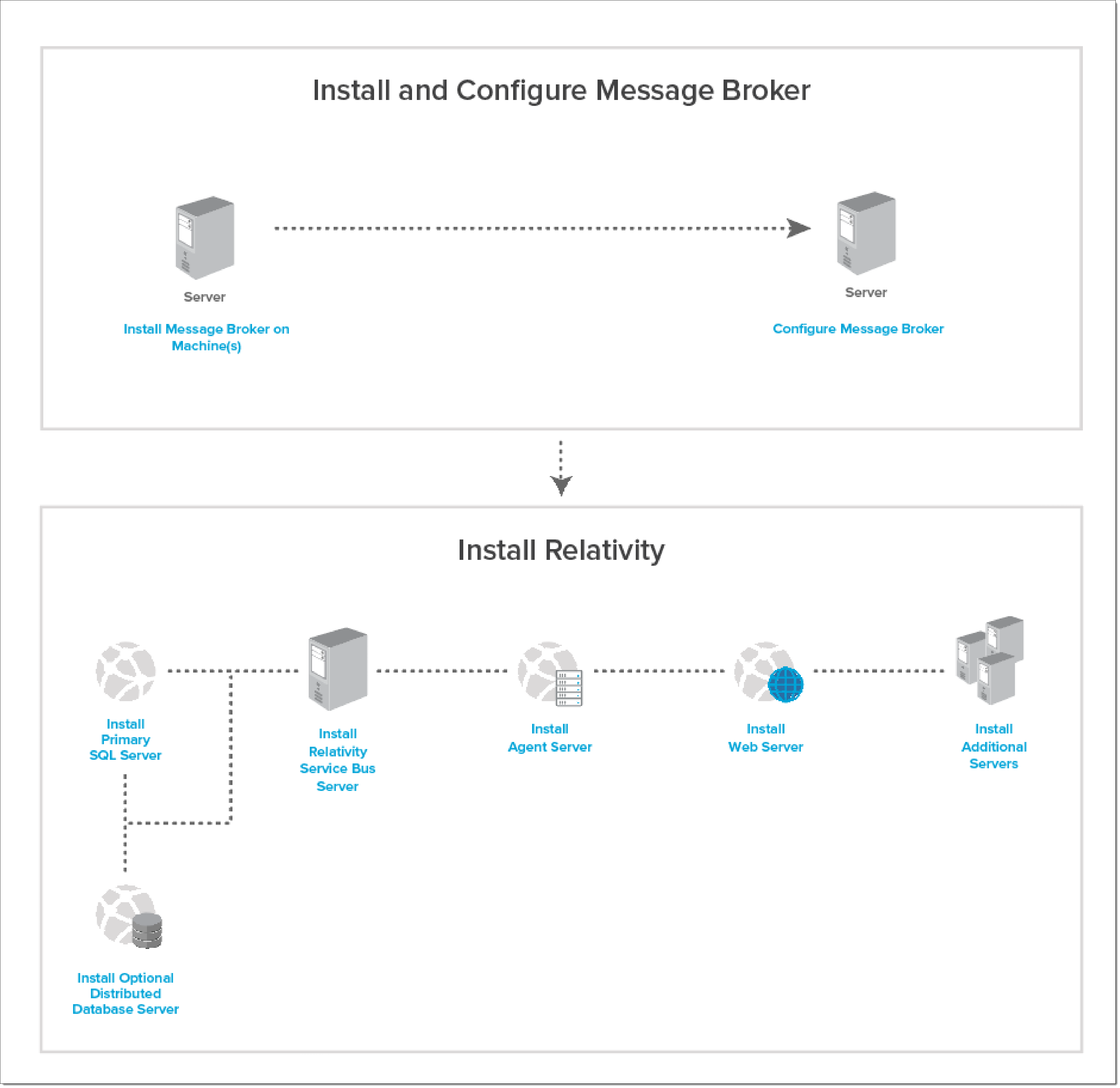 Before installing or upgrading, you must install and configure your environment’s message broker. Next, install or upgrade your primary SQL Server and the Relativity Service Bus. You can find information about your environment’s message broker in Pre-installation. For installation instructions, see Relativity installation.