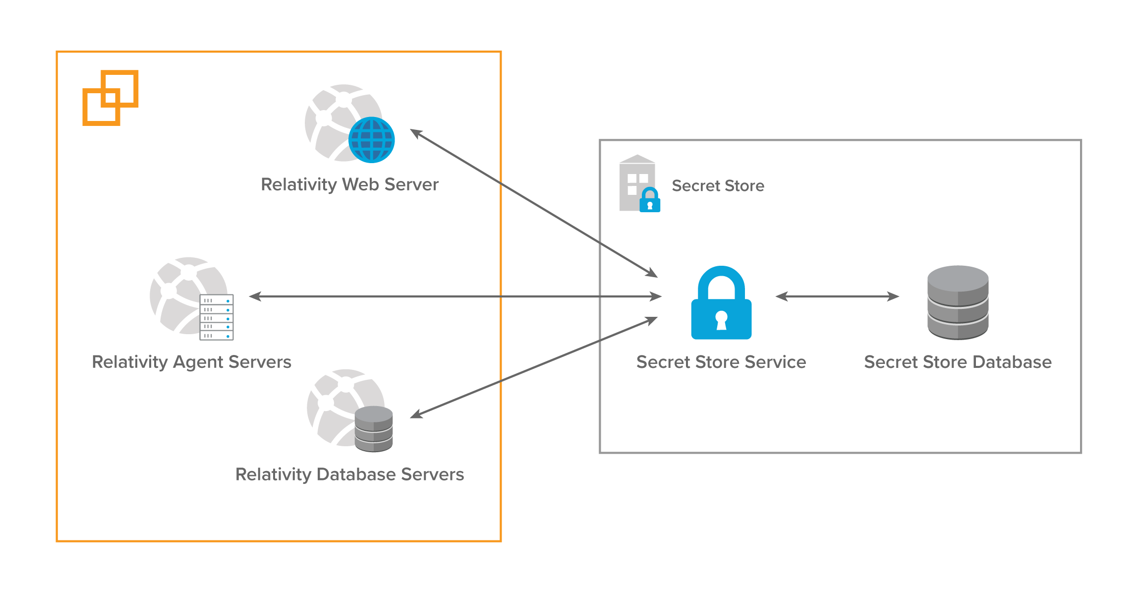 The Secret Store is a required component that provides secure, auditable storage for Relativity secrets. The secrets can be system account credentials, database connect strings, an instance setting that contains confidential information, like your SMTP credentials, or TLS certificates. All confidential information is stored securely in the Secret Store database. The Secret Store can be accessed only by authenticated servers.