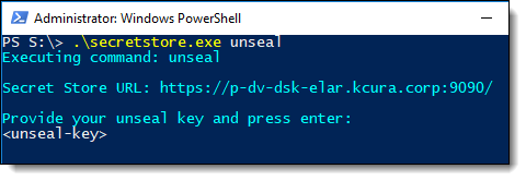 Starting in 1.2.12.5, the unseal key may be omitted from the command line. If omitted, you will be prompted for the unseal key. This behavior helps keep the unseal key out of logs. This change is isolated to the command line tool. If you are using an older version of Secret Store and want this enhancement, contact Relativity Support.