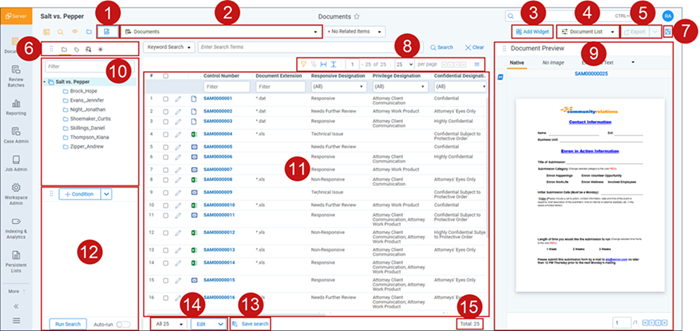 | 14 | Mass operations bar | Select an option from the menu to take mass action on some or all documents in the document list. |