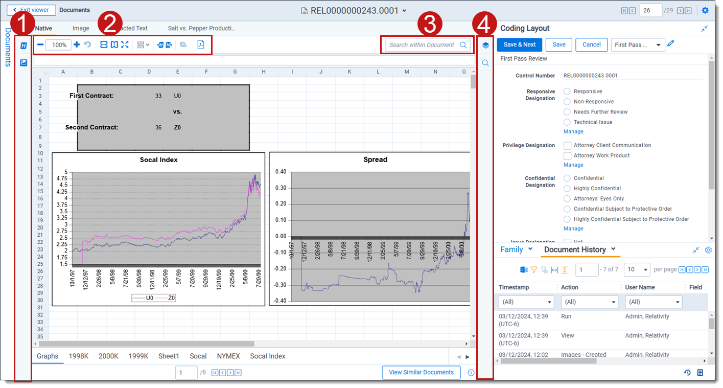 Viewer Search Bar | Enter a terms search to highlight the results in the Viewer. The Search Bar supports dtSearch and so proximity, fuzziness, and stemming can be used. |