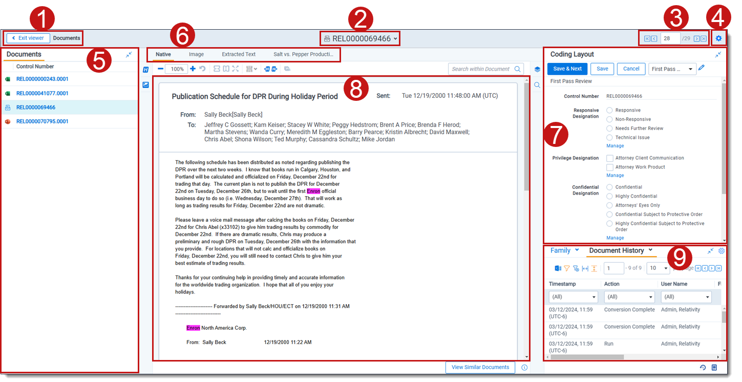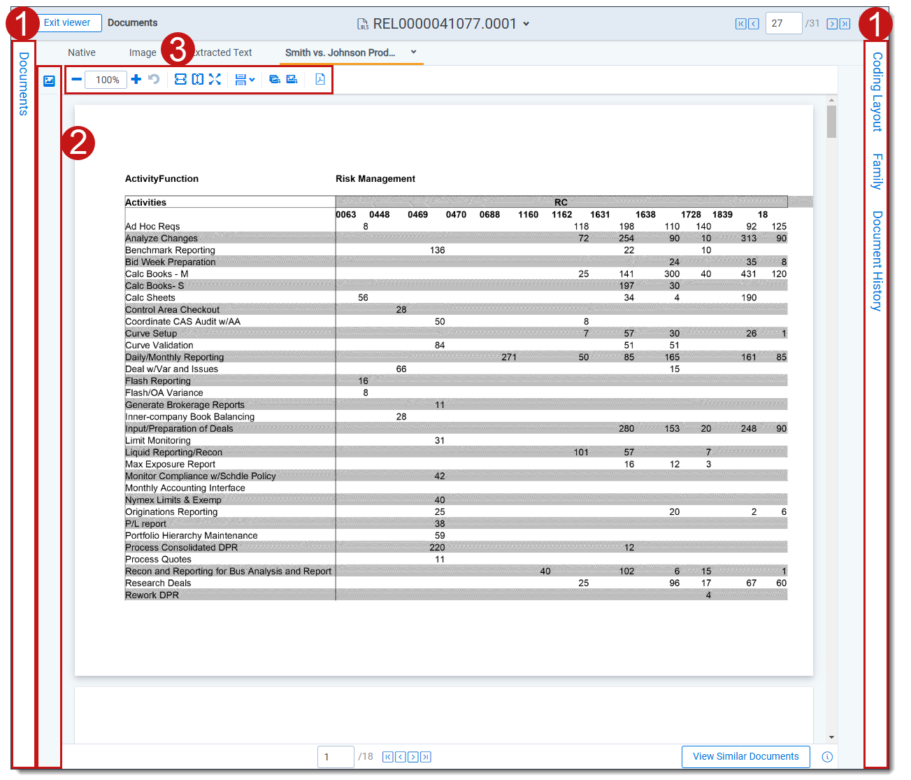 Viewer search bar | Enter terms to highlight the results in the Viewer. It supports dtSearch and so proximity, fuzziness, and stemming can be used. Navigate across Viewer search hits. |