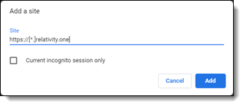 Relativity opens new windows where you can perform specific actions. Your web browser's pop-up blocker may block new windows from opening by default. Refer to Manage pop-ups for instructions to disable the pop-up blocker in Google Chrome. For instructions to disable pop-up blocker using a wildcard in Chrome, open a Chrome web browser and follow the instructions below: